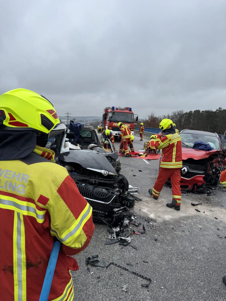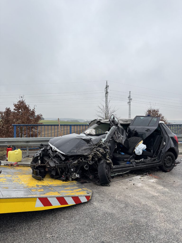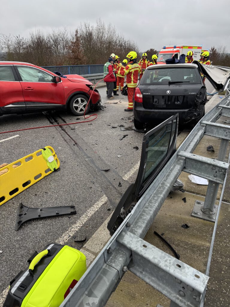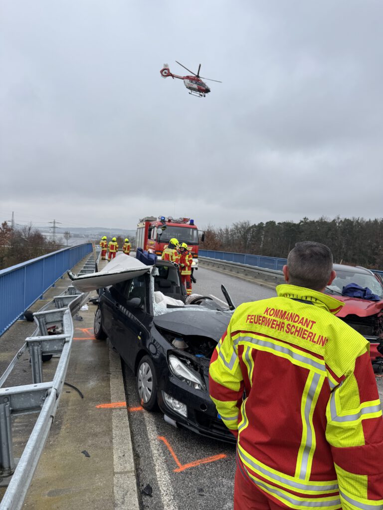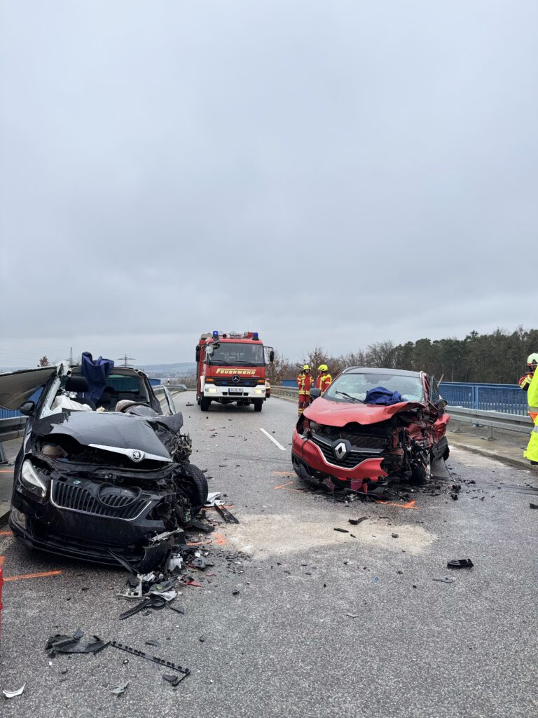 Auf der Brücke über die Südumgehung waren aus bisher unbekannten Gründen zwei Fahrzeuge frontal zusammengestoßen. Dabei wurde der Fahrer eines Skoda in seinem Fahrzeug eingeklemmt und schwer verletzt.