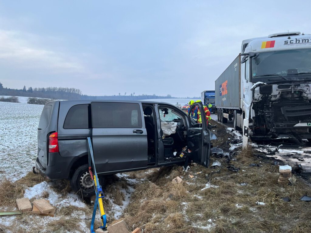Am Donnerstagnachmittag wurden wir gemeinsam mit vielen weiteren Rettungskräften aus dem südlichen Landkreis auf die St 2615 zwischen Eggmühl und Hagelstadt alarmiert. Laut Erstmeldung soll es dort zu einem Frontalcrash zwischen einem PKW (Kleintransporter) und einem LKW gekommen sein, wobei eine Person eingeklemmt wurde.